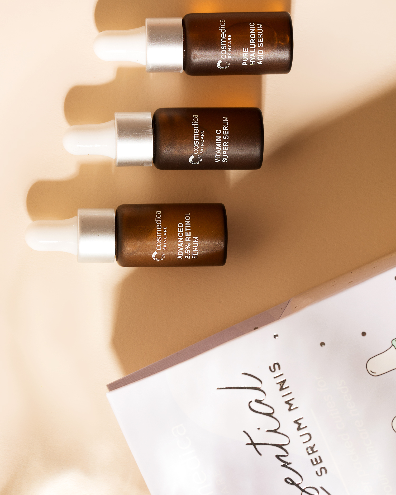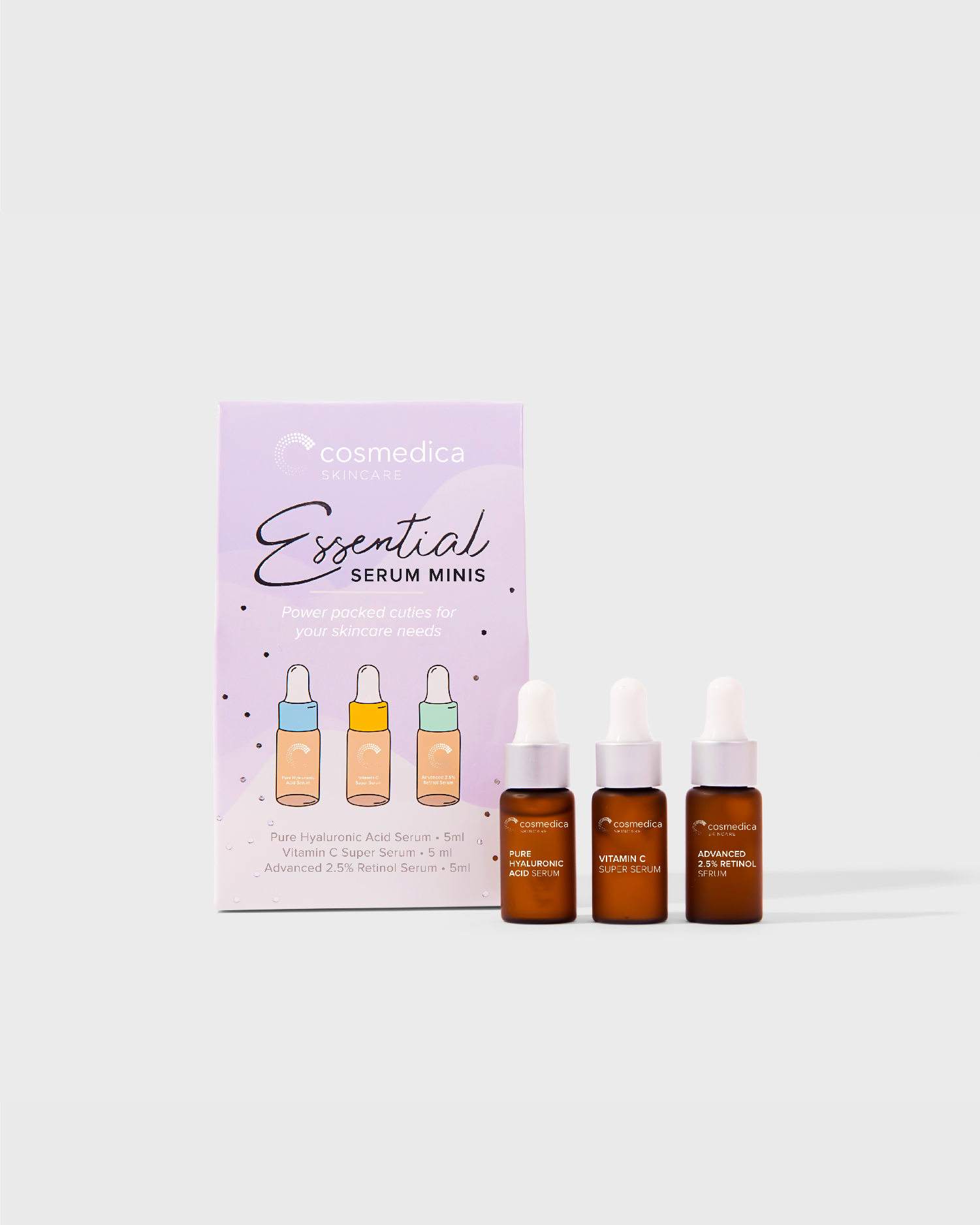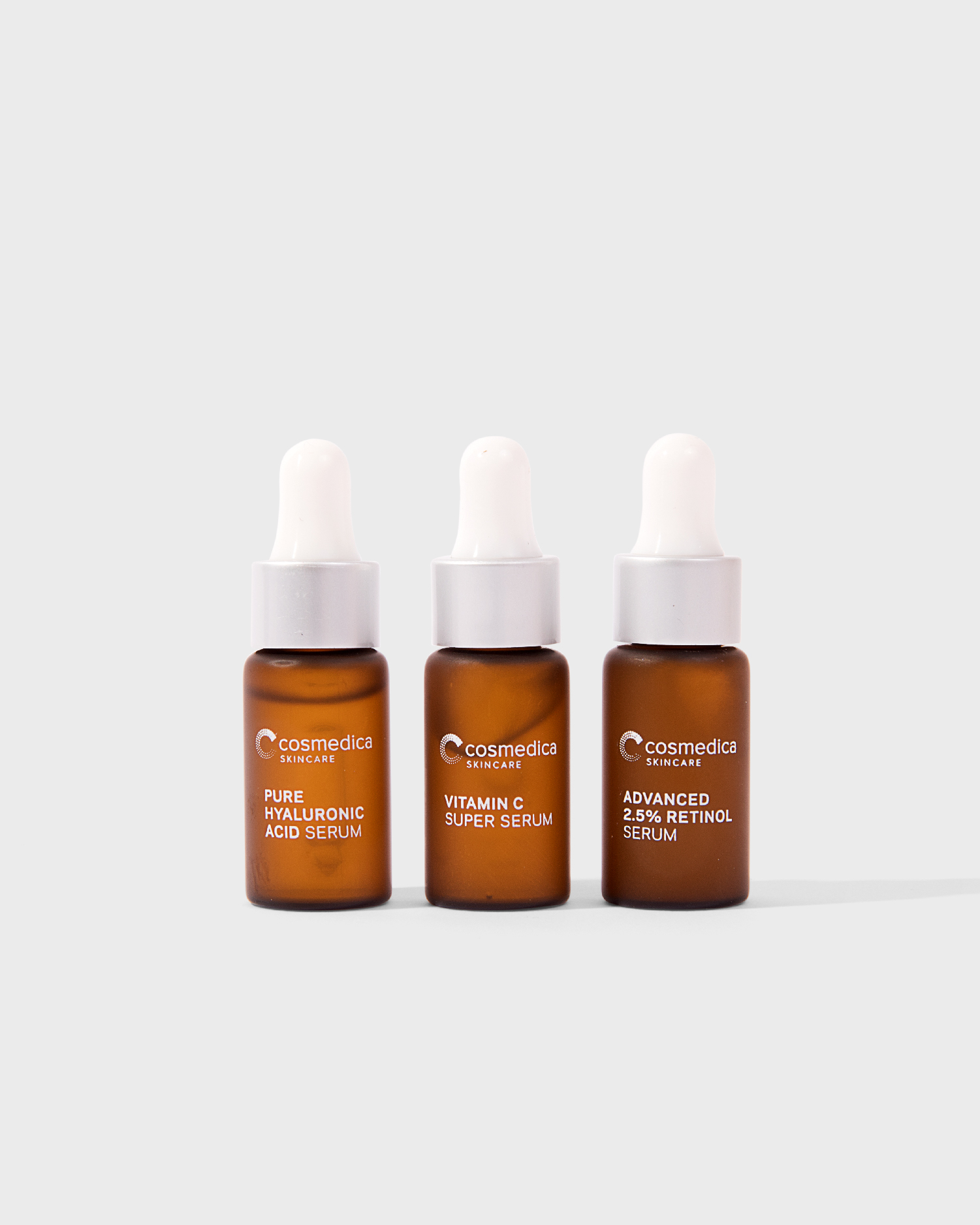 El suero de ácido hialurónico puro proporciona hidratación y el poder molecular de 1000 veces su peso en agua. El Súper Suero de Vitamina C combina una triple protección antioxidante para iluminar la tez apagada. Suero de retinol al 2.5% estimula la renovación celular y promueve el colágeno para una piel más radiante y saludable.