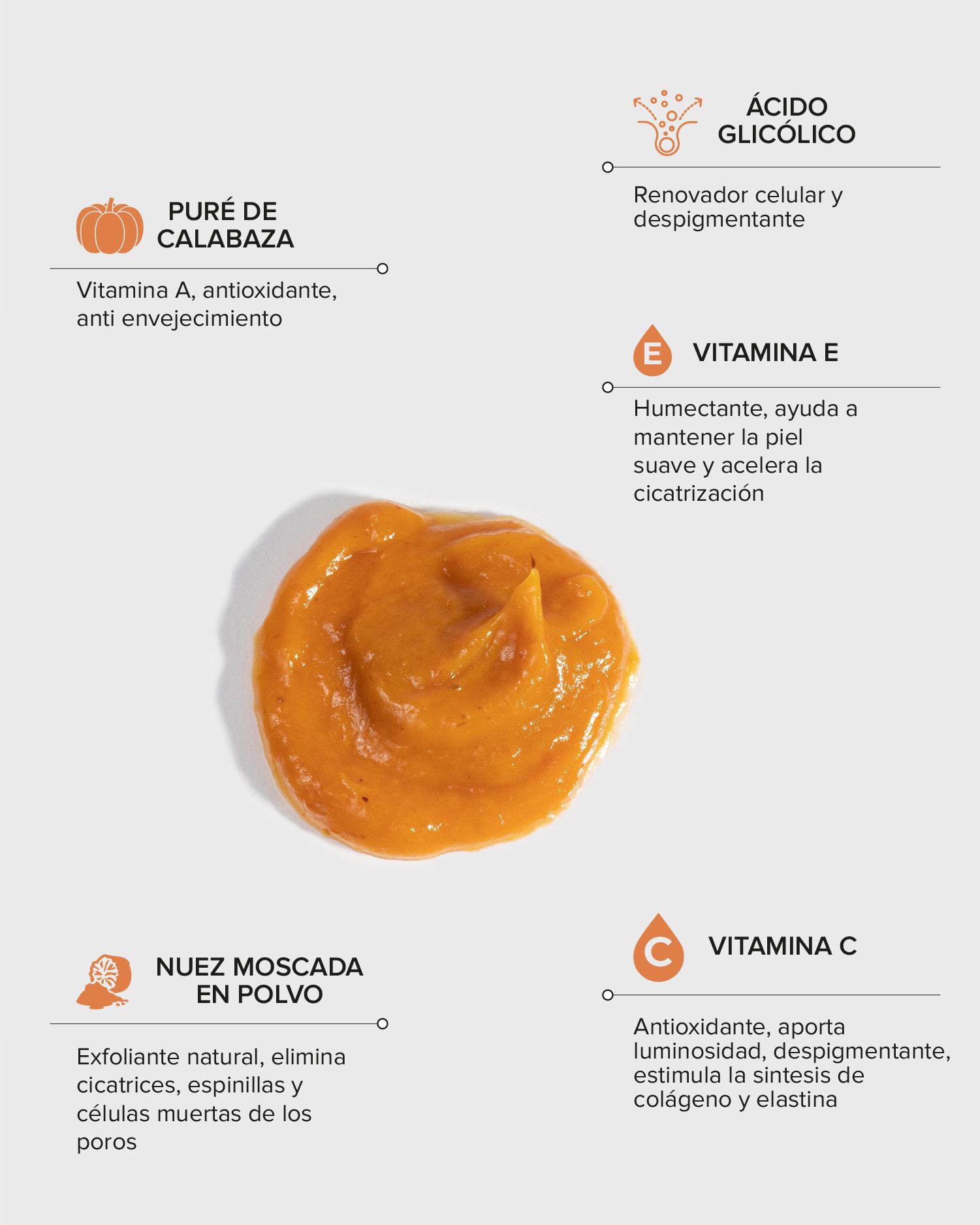 Mascarilla con AHA (ácidos alfa hidroxi) exfoliantes naturales. Mascarilla con calabaza rica en vitaminas A y C que proporciona protección antioxidante y ayuda a aumentar la producción de colágeno en la piel.