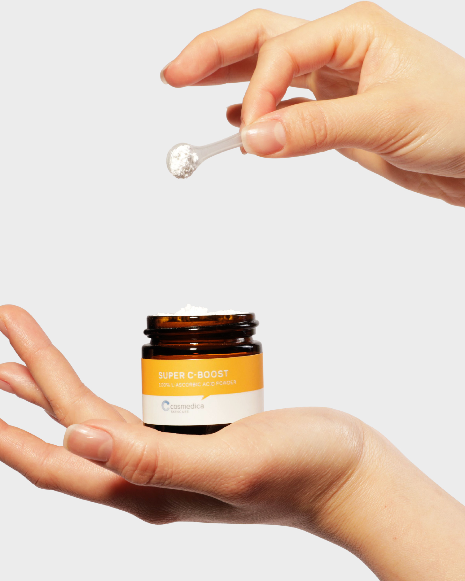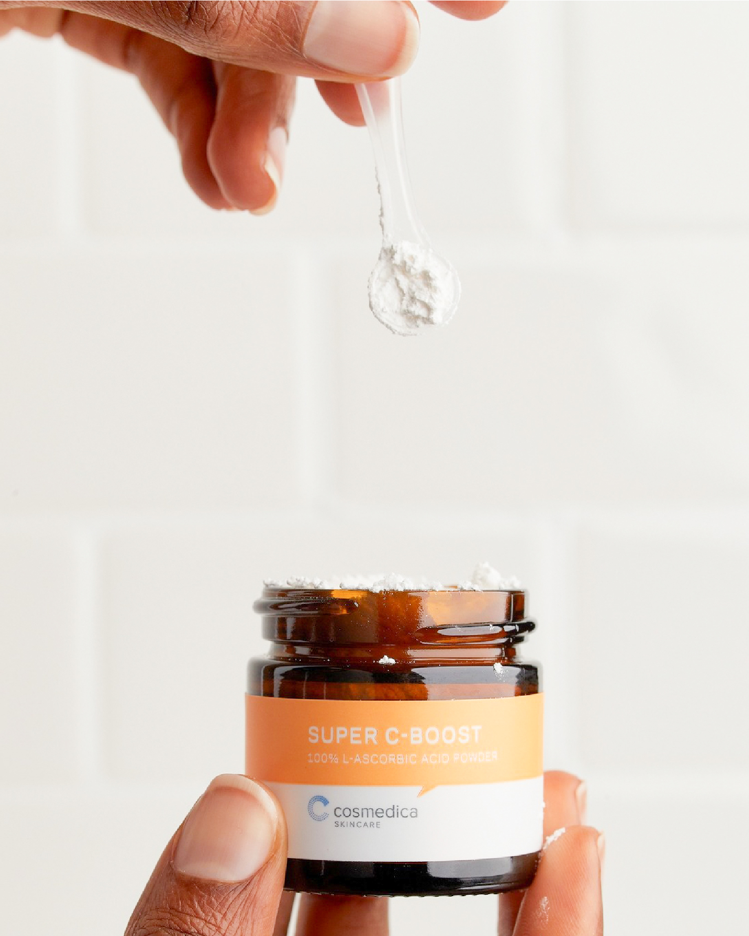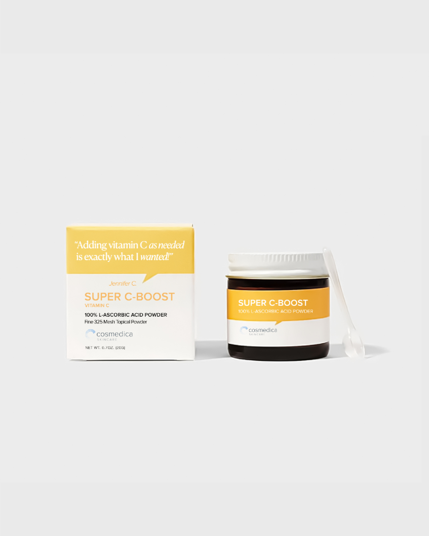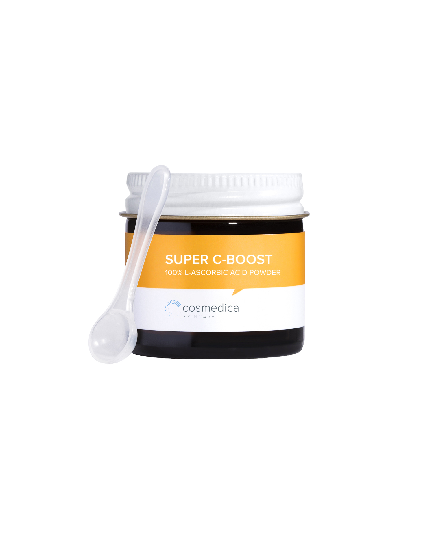 Cosmedica Skincare Super C-Boost es un fino polvo de vitamina C tópico. Creado para mejorar su rutina de cuidado de la piel con una dosis concentrada de ácido L-ascórbico al 100%. Una forma estable de vitamina C, el ácido L-ascórbico es un antioxidante eficaz conocido por iluminar el cutis apagado y combatir los signos del envejecimiento. Al instante, personalice y realce su suero o crema humectante con un súper impulso de vitamina C.